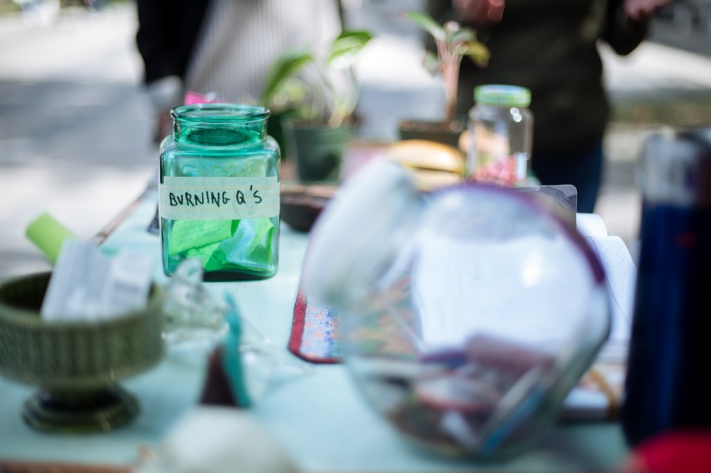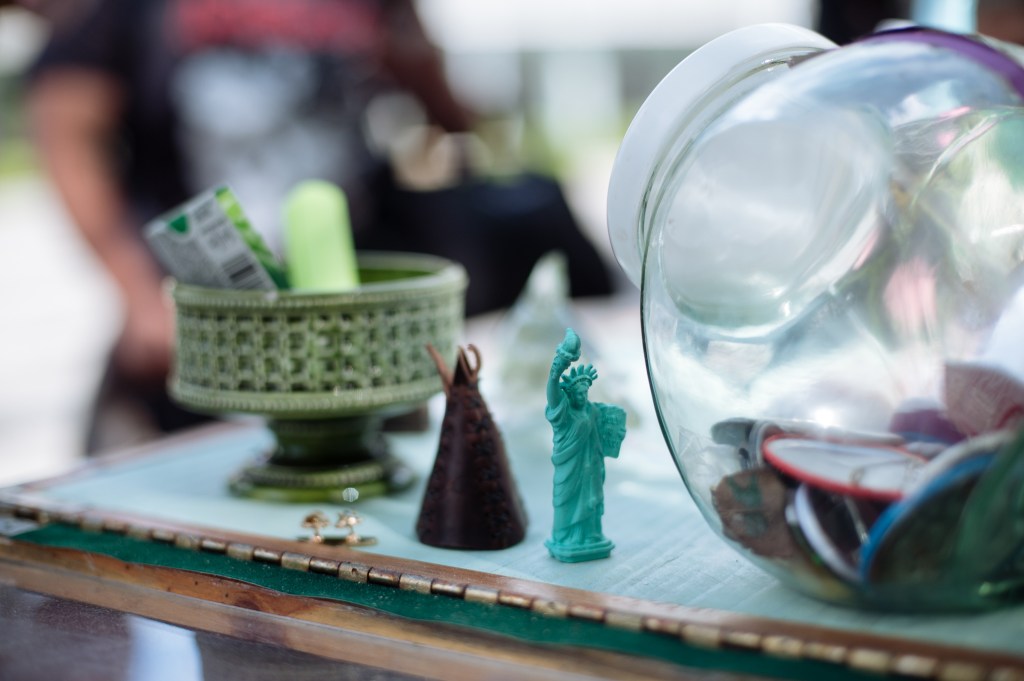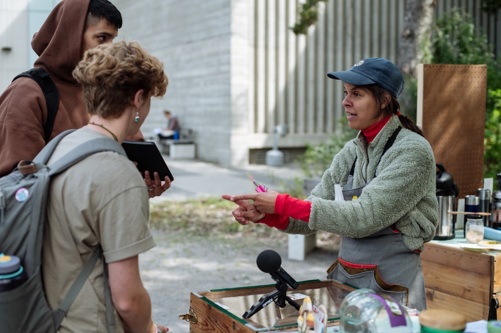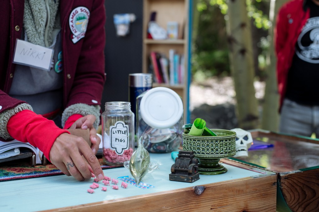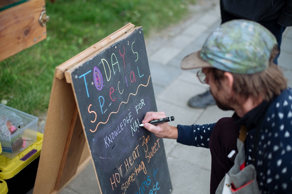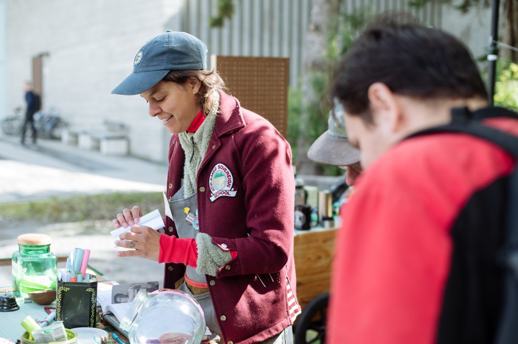 We are Lane Shordee and Nikki Martens, a creative duo investigating urban sustainability, ecology, and the economy via performance & installation. Our General Store is the first pop-up store that trades in the eight different forms of capital: Material (M), Intellectual (I), Living (L), Spiritual (Sp), Financial (F), Social (So), Experiential (E), and Cultural (C). At The General Store we recognize that it is the sum of these eight forms that contribute to a thriving, holistic, and sustainable community. The store becomes a research tool to see how these different forms of capital intermingle and coexist. Each iteration of the store begins with a varied stock of goods that gets us going: coffee, jokes, pins, and haircuts for example; but our inventory is primarily sourced from what the community has to offer and is willing to trade. These trades are documented within our sacred ledger book, which acts as an organic narrative of interactions. Past recordings include: “a beet for a beat”, “witch protection for craft supplies”, and our ever-popular “coffee for a joke”. Trades range from the ephemeral to the tangible, and together become an all day act of participant/artist based performances driven by the question of value. Fleeting goods, such as life stories or sage advice are collected as audio or video, which can then be traded back to participants in the form of ‘Cultural (C)’ or ‘Intellectual (I)’ capital. Physical objects become vectors for the exchange of ideas. Ultimately we are asking our beloved customers what has value to them, how do we measure that value, and how do we come to an equally beneficial exchange?