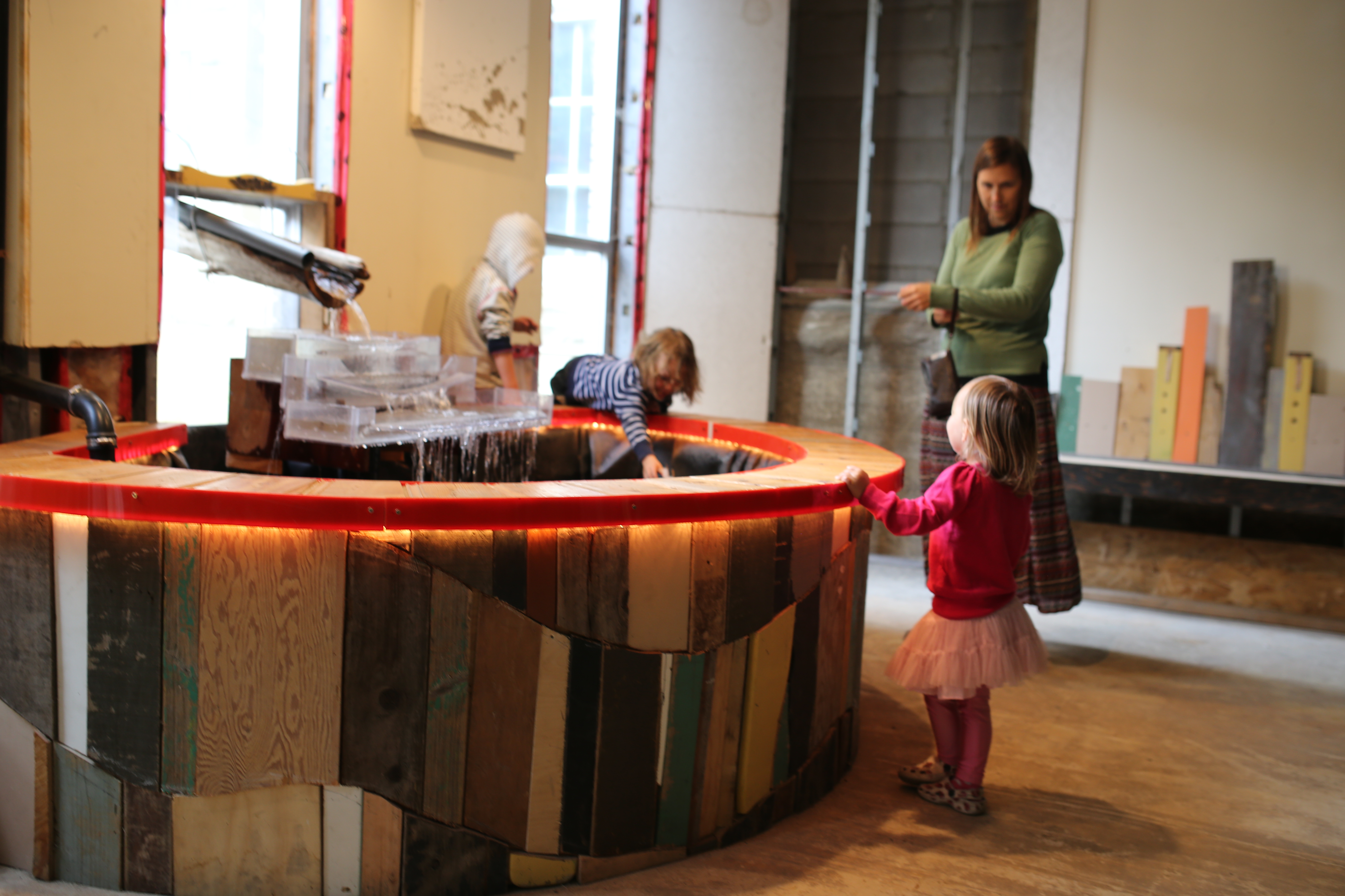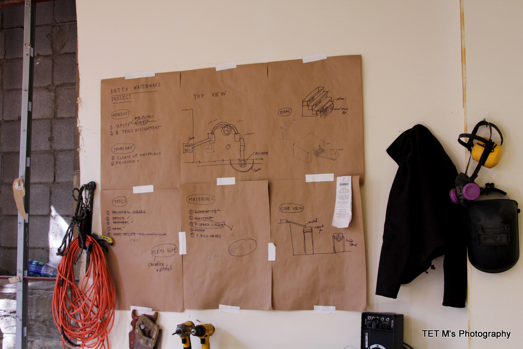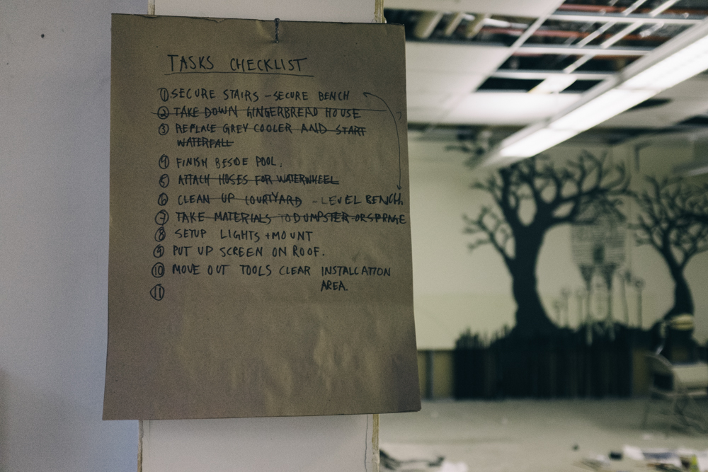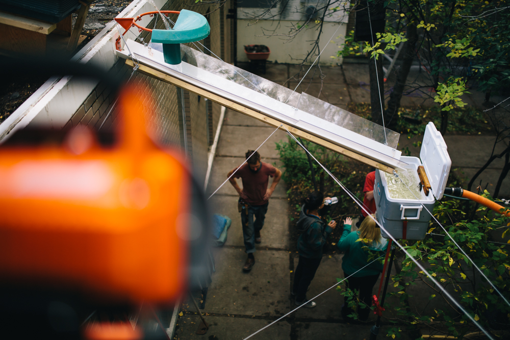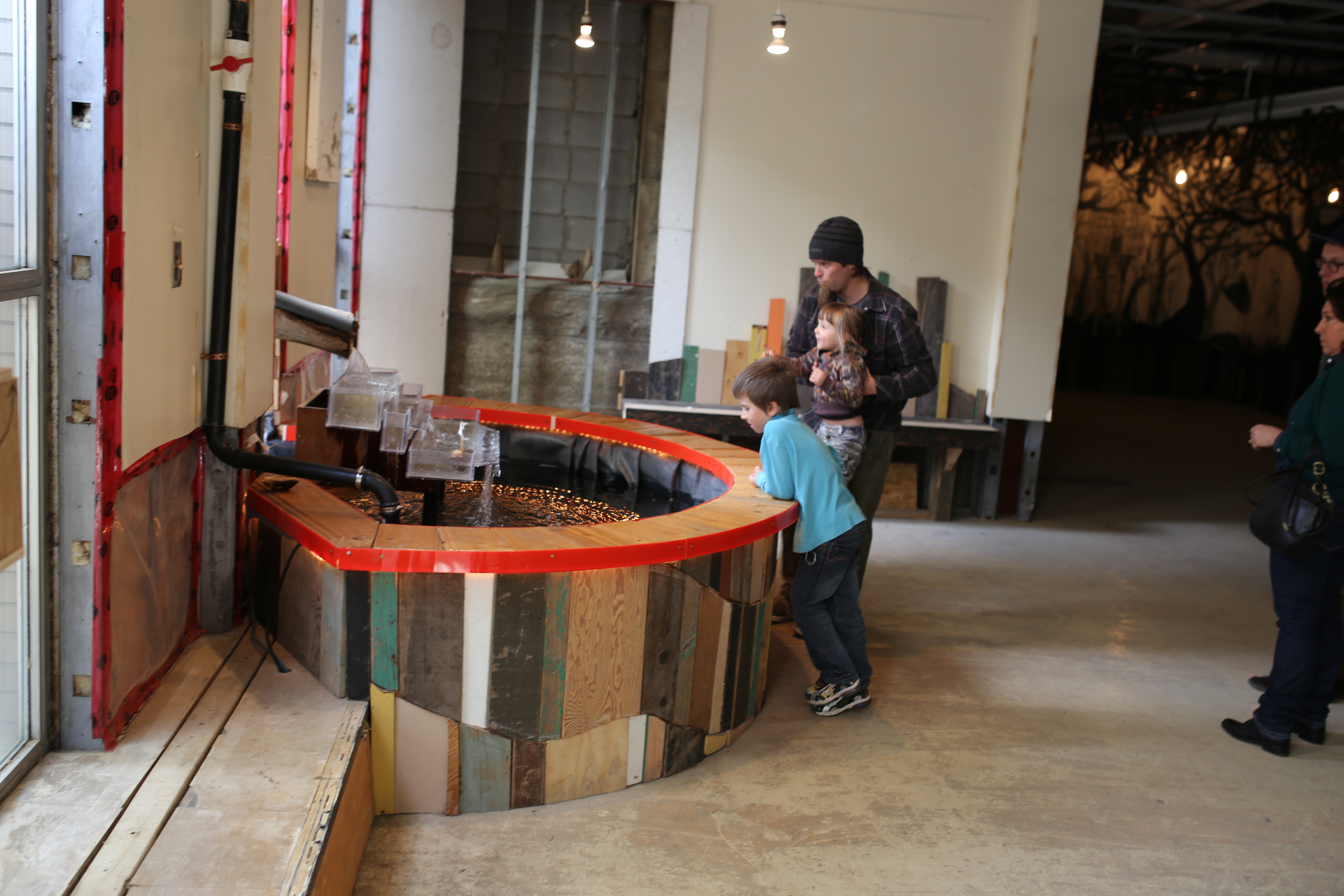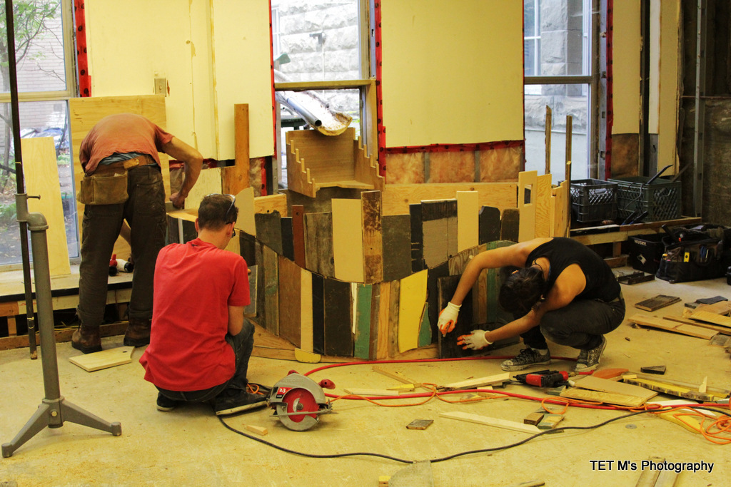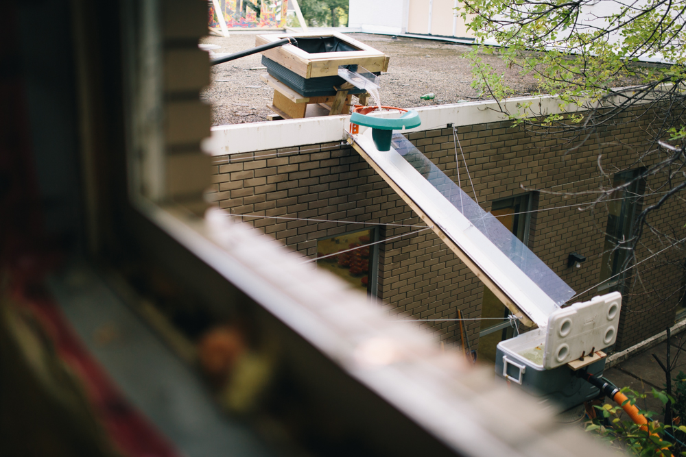 Waterways was constructed using materials primarily salvaged from the flood-impacted neighborhoods in Calgary, as well as materials found on site in the historic King Edward School. It was built as part of Phantom Wing and the King Edward School Arts incubator initiative of CSapce.