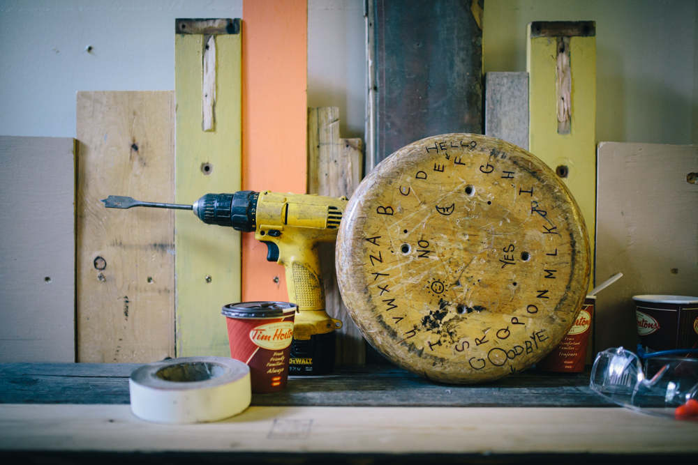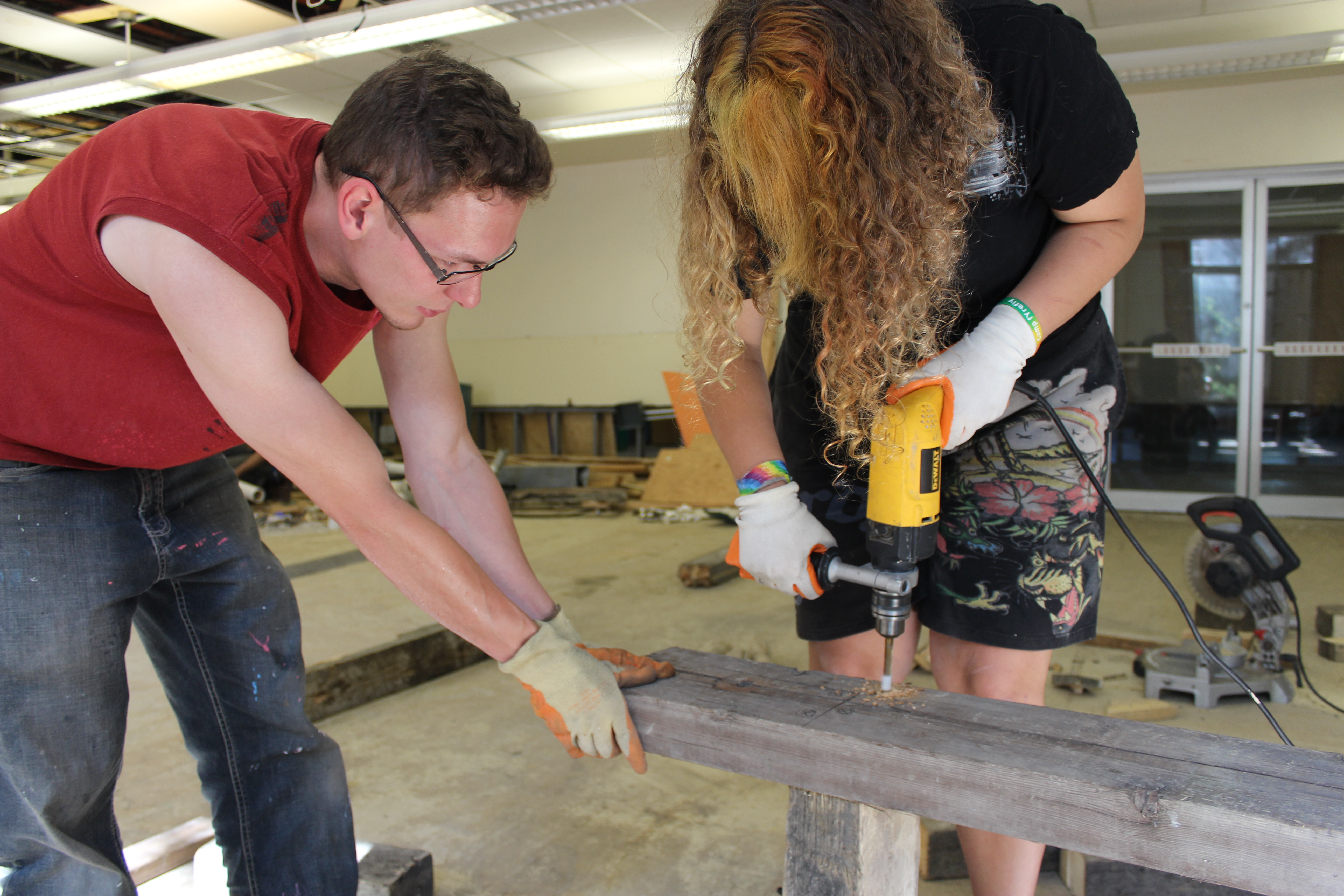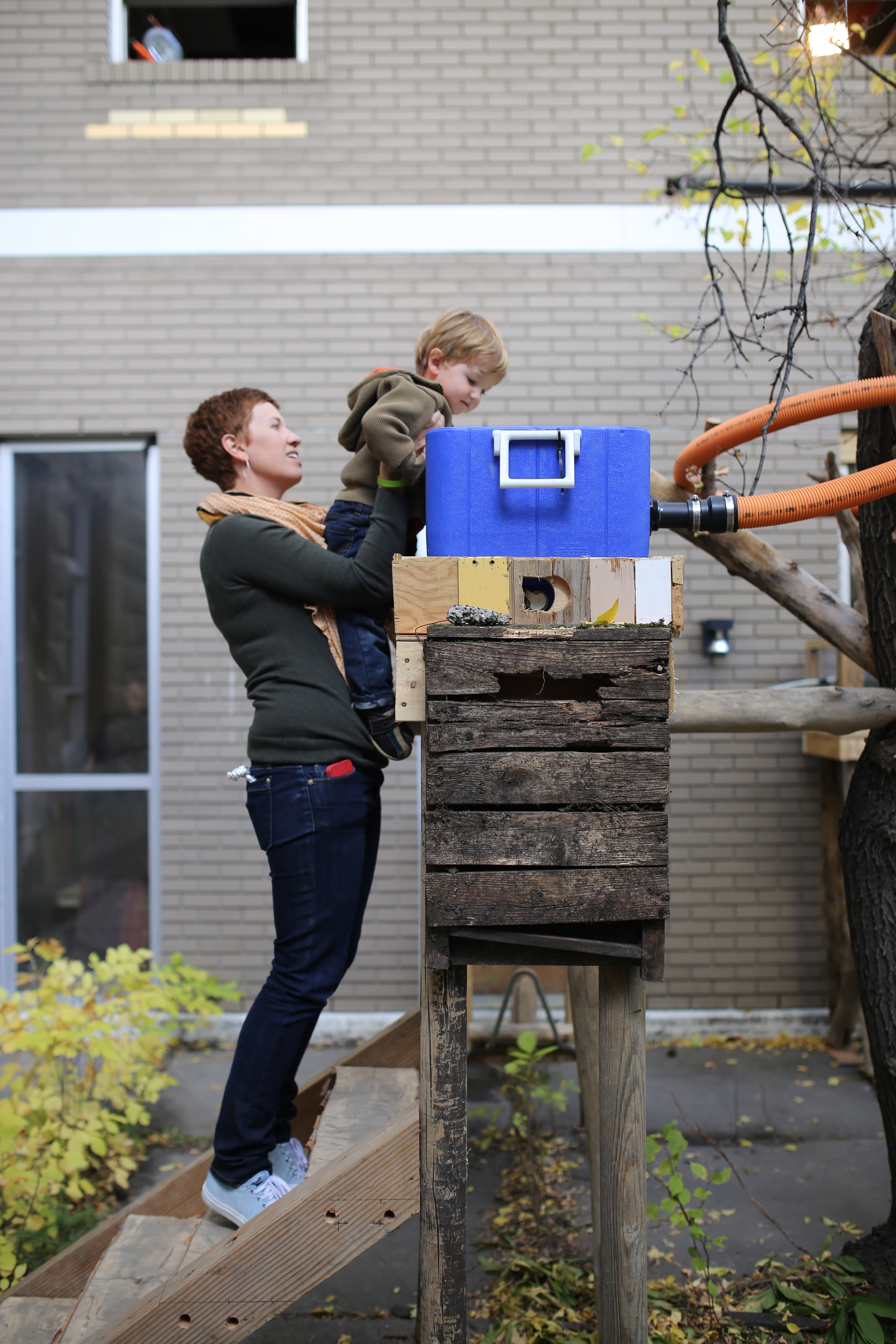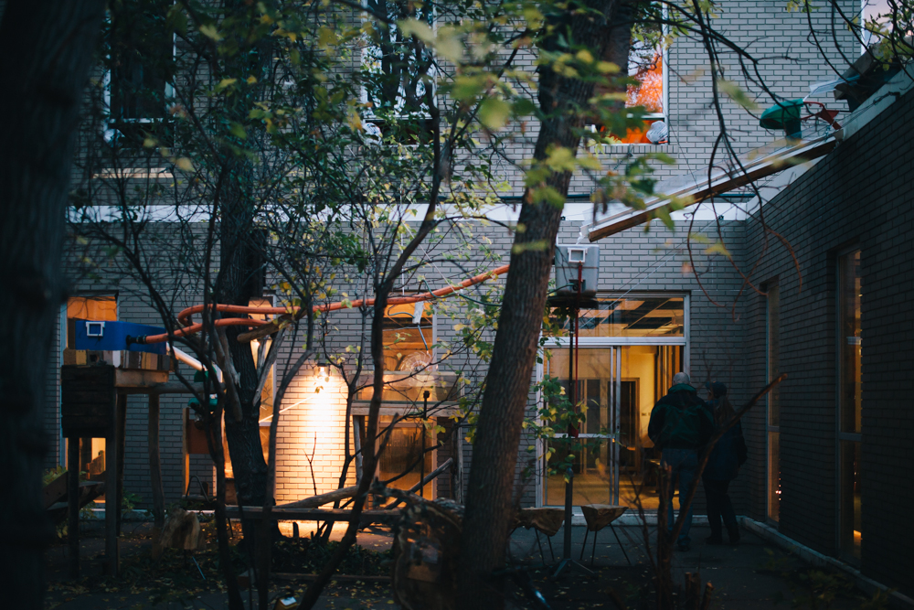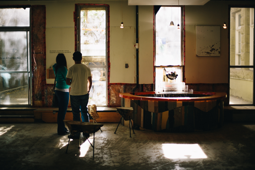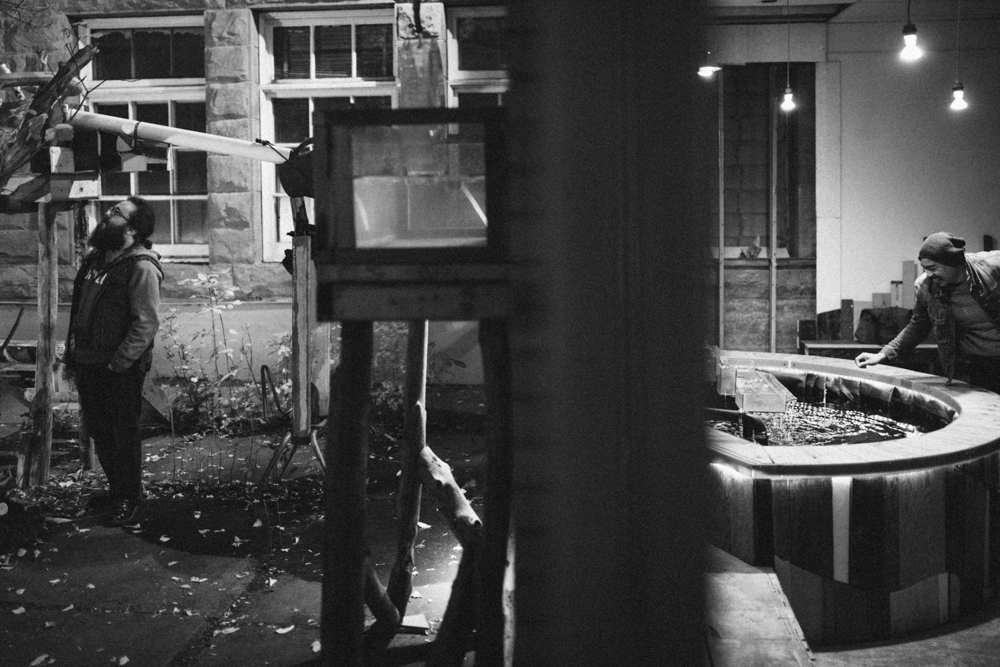Waterways was constructed using materials primarily salvaged from the flood-impacted neighborhoods in Calgary, as well as materials found on site in the historic King Edward School. It was built as part of Phantom Wing and the King Edward School Arts incubator initiative of CSapce.