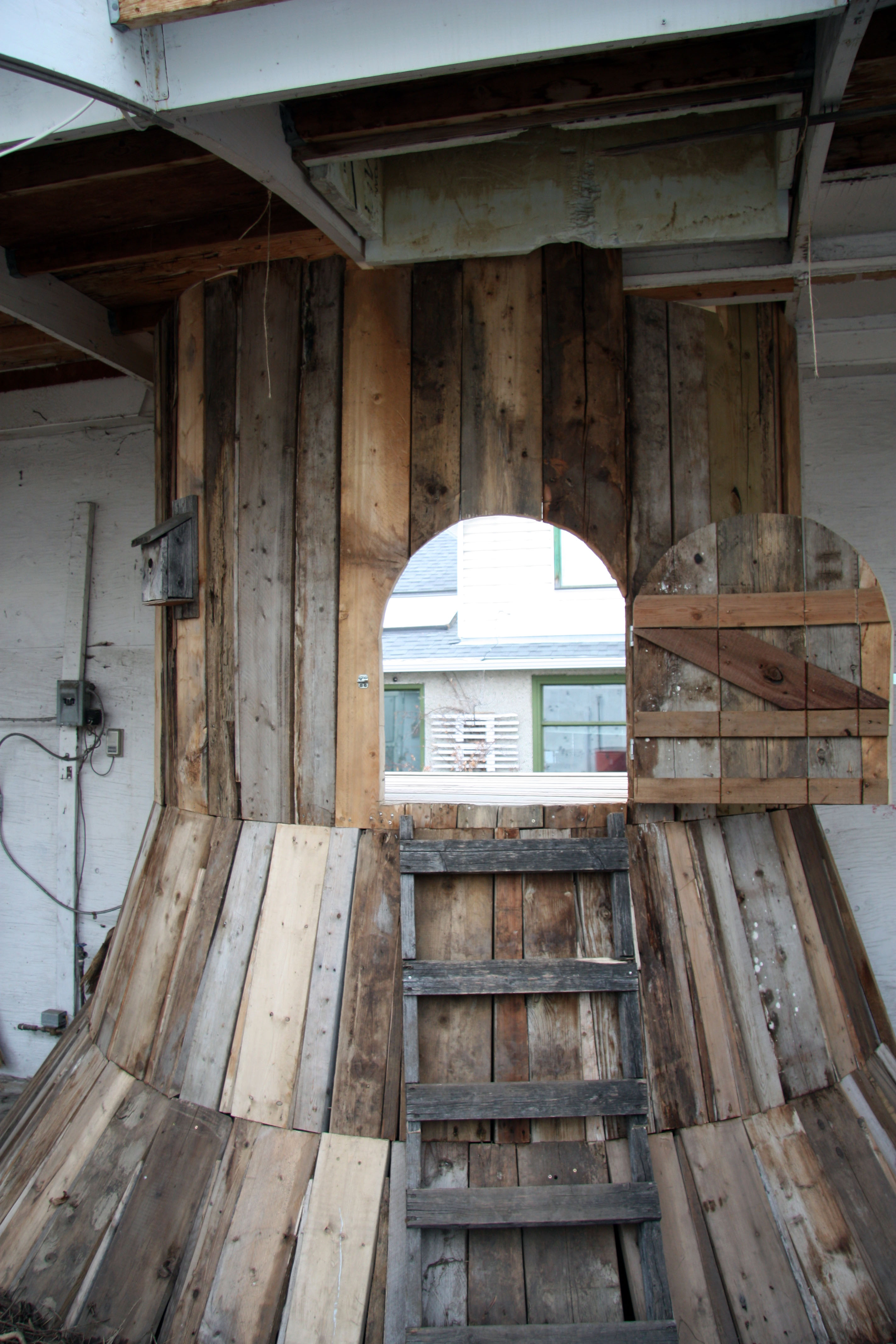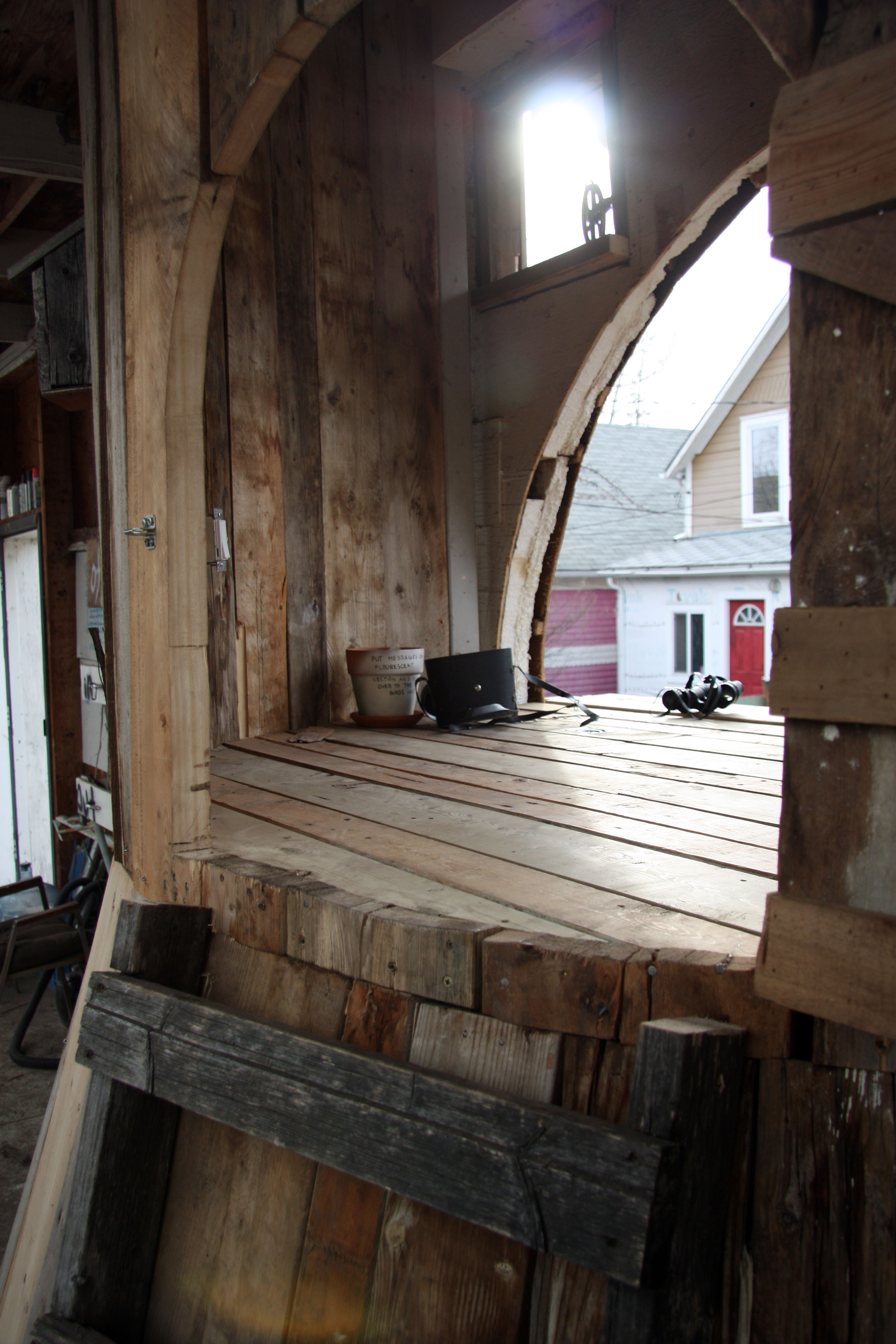 The process began with tearing up the existing structures (shelves/planters) and mining materials from the concrete underbelly in order to cache the what was useable. As I broke down the material my idea shifted into what it exists as now; a giant tree house that contains a mezzanine platform that opens up to the outside. The night I cut a hole into the back wall I felt instantly more connected to the neighbouring houses, and when the platform was installed there was no hiding the fact that this mark drew new attention to the greenhouse.